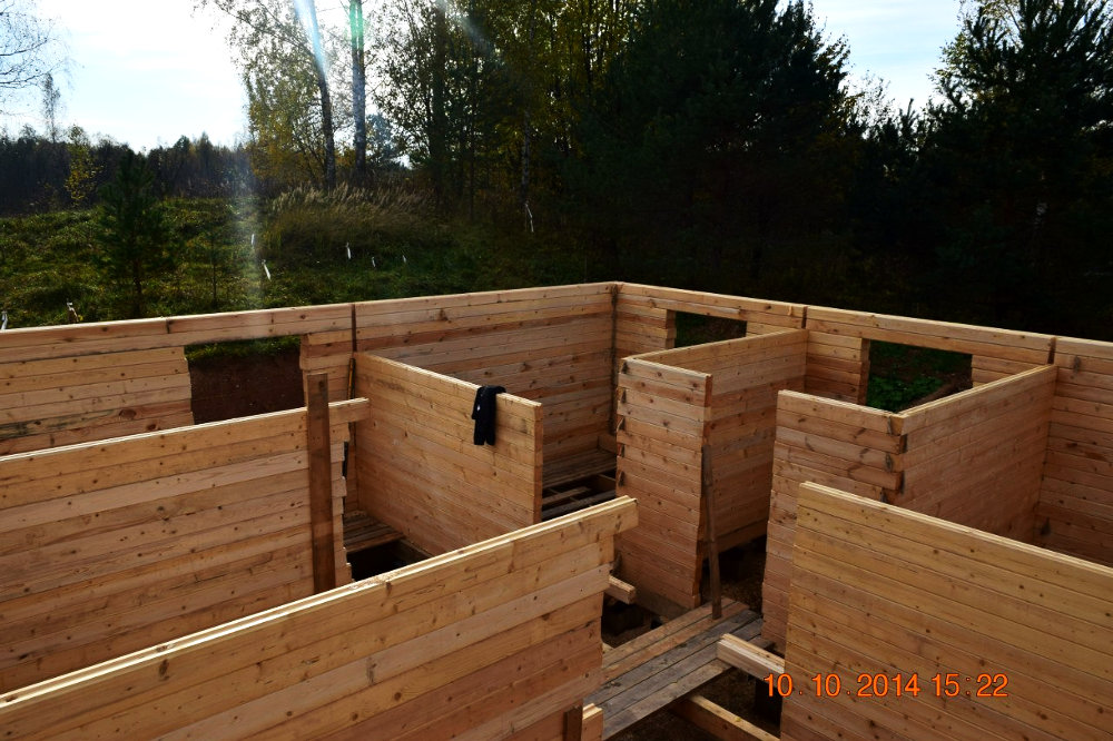 В 2012 году, уже определившись с местом для будущей жизни, Саша и Света приехали в поселение на всё лето. Жили в палатке, под большим уличным тентом (3×9 м). К концу лета с помощью соседей поставили сруб бани размером 3×4 м (изготовили в Опочке, с доставкой обошёлся в 34,500 рублей). Однако стройку заморозили, сосредоточившись на основном доме, чтобы скорее переехать. Лишь через год, приехав в поселение на несколько летних недель, накрыли баню крышей. В таком виде она и стоит сегодня, ждёт своего часа.